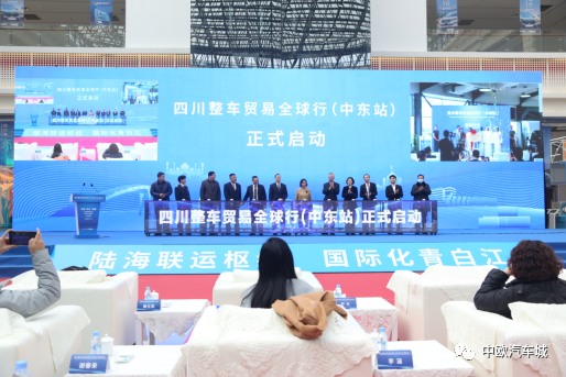 2023年1月5日,四川整车贸易全球行启动仪式(中东站)在阿联酋迪拜阿维尔汽车交易中心、成都市青白江区中欧汽车城两个会场线上线下同时举行。